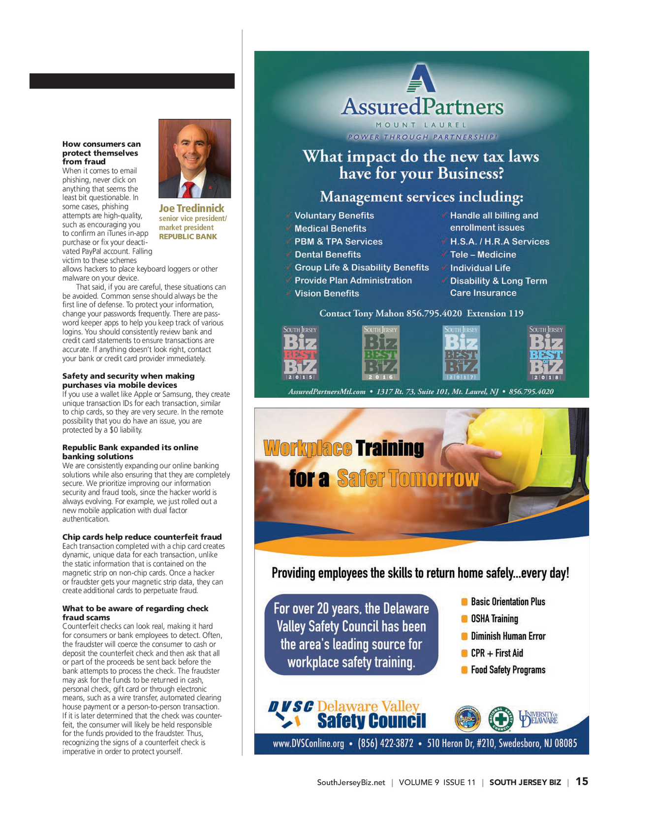 SJBiz_OfficeSpace_1119_Layout 1 11 / 18 / 19 2 : 46 PM Page 3 How consumers can protect themselves from fraud When it comes to email phishing , never click on anything that seems the least bit questionable . In some cases , phishing Joe Tredinnick attempts are high - quality , senior vice president / such as encouraging you market president to confirm an iTunes in - app REPUBLIC BANK purchase or fix your deacti - vated PayPal account . Falling victim to these schemes allows hackers to place keyboard loggers or other malware on your device . That said , if you are careful , these situations can be avoided . Common sense should always be the first line of defense . To protect your information , change your passwords frequently . There are pass - word keeper apps to help you keep track of various logins . You should consistently review bank and credit card statements to ensure transactions are accurate . If anything doesn’t look right , contact your bank or credit card provider immediately . Safety and security when making purchases via mobile devices If you use a wallet like Apple or Samsung , they create unique transaction IDs for each transaction , similar to chip cards , so they are very secure . In the remote possibility that you do have an issue , you are protected by a $ 0 liability . Republic Bank expanded its online banking solutions We are consistently expanding our online banking solutions while also ensuring that they are completely secure . We prioritize improving our information security and fraud tools , since the hacker world is always evolving . For example , we just rolled out a new mobile application with dual factor authentication . Chip cards help reduce counterfeit fraud Each transaction completed with a chip card creates dynamic , unique data for each transaction , unlike the static information that is contained on the magnetic strip on non - chip cards . Once a hacker or fraudster gets your magnetic strip data , they can create additional cards to perpetuate fraud . What to be aware of regarding check fraud scams Counterfeit checks can look real , making it hard for consumers or bank employees to detect . Often , the fraudster will coerce the consumer to cash or deposit the counterfeit check and then ask that all or part of the proceeds be sent back before the bank attempts to process the check . The fraudster may ask for the funds to be returned in cash , personal check , gift card or through electronic means , such as a wire transfer , automated clearing house payment or a person - to - person transaction . If it is later determined that the check was counter - feit , the consumer will likely be held responsible for the funds provided to the fraudster . Thus , recognizing the signs of a counterfeit check is imperative in order to protect yourself . SouthJerseyBiz.net | VOLUME 9 ISSUE 11 | SOUTH JERSEY BIZ | 15
