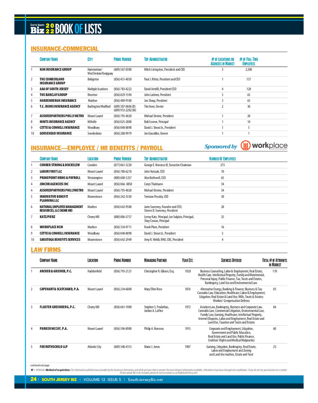 Book of Lists 2022 - v2 - FINAL_Layout 1 5 / 10 / 22 11 : 26 AM Page 8 LAW FIRMS CONTINUED COMPANY NAME LOCATION PHONE NUMBER MANAGING PARTNER YEAR EST . SERVICES OFFERED TOTAL # OF ATTORNEYS IN MARKET 6 SHERMAN , SILVERSTEIN , Moorestown ( 856 ) 662 - 0700 Daniel J . Barrison , Esquire ; 1975 Real Estate , Bankruptcy , Business & Corporate , Litigation , 23 KOHL , ROSE & PODOLSKY , P.A . Matthew Podolnick , Esquire Estate Planning and Administration , Divorce and Family Law , Zoning & Land Use , Employment , Banking & Finance 7 LAULETTA BIRNBAUM Sewell ( 856 ) 232 - 1600 Frank A . Lauletta and 2009 General Corporate , Real Estate Leasing , Acquisition , Finance & 20 Lloyd C . Birnbaum Development , Energy & Environmental , High Net Worth Divorce , Philadelphia Zoning Law , Litigation , Intellectual Property , Technology , Software , Licensing & Distribution , Internet & Ecommerce , Mergers & Acquisitions , Venture Capital and Emerging Growth , International Law 8 DUANE MORRIS LLP Cherry Hill ( 856 ) 874 - 4200 Hersh Kozlov 2009 Complex Litigation and Alternative Dispute Resolution ; 20 Intellectual Property and IP Litigation ; Products Liability , Toxic Torts , and Product Safety ; White - Collar Criminal Litigation ; Gaming ; Corporate , Securities , Mergers and Acquisitions ; Real Estate 9 BALLARD SPAHR LLP Mount Laurel ( 856 ) 761 - 3400 Jeffrey S . Beenstock 1999 Litigation ( including environmental law and product liability ) , 19 Real Estate , Finance , Labor and Employment 10 STRADLEY RONON Cherry Hill ( 856 ) 321 - 2400 Francis X . Manning 1926 Commercial Litigation , Corporate Law , Real Estate and 14 STEVENS & YOUNG LLP Environmental Law , Trusts & Estates , Employment Law 11 DILWORTH PAXSON LLP Cherry Hill ( 856 ) 675 - 1900 Mark A . Schiavo 1933 Corporate , Litigation , Real Estate , Bankruptcy 12 12 COOPER LEVENSON , P.A . Cherry Hill ( 856 ) 795 - 9110 Lloyd D . Levenson and 1957 Casino , iGaming , Tax & Business , Estate Planning , 12 Robert E . Salad Family Law , Bankruptcy 13 WEBER GALLAGHER SIMPSON Mount Laurel ( 856 ) 667 - 9111 Jeffrey D . Newby 1996 Workers ’ Compensation , Commercial Transportation , 12 STAPLETON FIRES & NEWBY General Liability , Employment 14 OBERMAYER REBMANN Mount Laurel ( 856 ) 795 - 3300 Matthew A . Green and 1983 Family Law , Business & Finance , Labor Relations & 11 MAXWELL & HIPPEL LLP Shari B . Veisblatt Employment , Litigation , Trusts & Estates ; Bankruptcy & Business Reorganizations , Government & Public Policy 15 STARK & STARK Marlton ( 856 ) 874 - 4443 Michael Donahue 1933 Business & Corporate , Litigation , Personal Injury , Family Law , 7 Workers ’ Compensation , Wills & Estate Planning 16 MATTIONI , LTD Swedesboro ( 856 ) 241 - 9779 Michael Mattioni 1963 Admiralty & Maritime ; Business , Finance , & Corporate ; Civil Litigation ; 7 Employment and Civil Rights ; Environmental ; Estate Planning , Trusts , & Estate Administration Insurance ; Longshore & Harbour Workers ' Compensation Act & Workers ' Compensation Claims ; Real Estate , Personal Injury , Transportation 17 CHARNY , KARPOUSIS , ALTIERI Marlton ( 856 ) 574 - 4343 Karen Rose Karpousis , 1999 Divorce and Family Law , 7 & DONOIAN , P.C . Michelle Altieri , including Mediation and Arbitration Nicole Donoian - Pody 18 FLORIO PERRUCCI STEINHARDT Cherry Hill ( 856 ) 853 - 5530 Louis Cappelli Jr . 1996 Government Affairs , Labor and Employment , Real Estate 6 CAPPELLI TIPTON & TAYLOR and Land Use / Redevelopment , Workers ’ Compensation 19 REGER RIZZO & DARNALL LLP Mount Laurel ( 856 ) 778 - 8950 Richard M . Darnall 1992 Alternative Dispute Resolution , Bankruptcy & Creditor’s Rights , 6 Business Succession Planning , Commercial Finance , Corporate & Business Services , Directors & Officers Liability , Employment Practices , Entertainment , Hospitality & Sports Law , Estates & Trusts , Franchise & Distribution , Immigration , Insurance Practices , Intellectual Property , Internal Investigations , Litigation , Local Counsel Capabilities , Privacy & Data Security , Professional Liability , Real Estate , Regulatory , Special Education , Transportation & Logistics , Utility , Zoning & Land Use 20 SCHNADER HARRISON Cherry Hill ( 856 ) 482 - 5222 Lisa J . Rodriguez 1935 Financial Services , Labor & Employment , 6 SEGAL & LEWIS LLP Class Action , Litigation 21 POSTERNOCK APELL PC Moorestown ( 856 ) 642 - 6445 Dan Posternock and 2000 Litigation , Special Education , Estate Planning 6 Jeffrey Apell and Real Estate , Estate Administrations 22 GENOVA BURNS LLC Camden ( 973 ) 533 - 0777 James Burns 1989 Alcohol & Regulated Products , Appellate Litigation , Autonomous 4 Vehicle , Aviation and Aircraft , Banking & Commercial Litigation , Bankruptcy , Cannabis , Casino & Gaming , Commercial & Residential Real Estate , Corporate Law , Criminal , Election Law , Energy & Utility , Environmental , Fashion , Franchise , Health & Hospital , Immigration , Land Use , Cyber & Data Security , Government , Transportation Logistics 23 WESTMORELAND VESPER West Atlantic City ( 609 ) 645 - 1111 R.C . Westmoreland 1980 Business Transactions , Commercial Disputes 3 QUATTRONE Personal Injury 24 MORGAN LAW LLC Marlton ( 856 ) 375 - 2985 Kenneth M . Morgan 2015 Real Estate and Corporate Law 2 25 KAPLIN STEWART MELOFF Cherry Hill / ( 856 ) 675 - 1550 Maury B . Reiter , Esq . 1997 Real Estate Transaction , Land Use & Zoning , Construction , 1 REITER & STEIN , P.C . Philadelphia Business and Corporate , Litigation , Estates and Trusts , Employment , Environmental continued next page W = Withheld Method of acquisition : The information published was provided by the businesses themselves and while we have tried to present the most relevant information available , information may have changed since publication . If you do not see your business on a certain list but would like to be included , please be sure to contact us at Biz @ SouthJersey.com . SouthJerseyBiz.net | VOLUME 12 ISSUE 5 | SOUTH JERSEY BIZ | 25