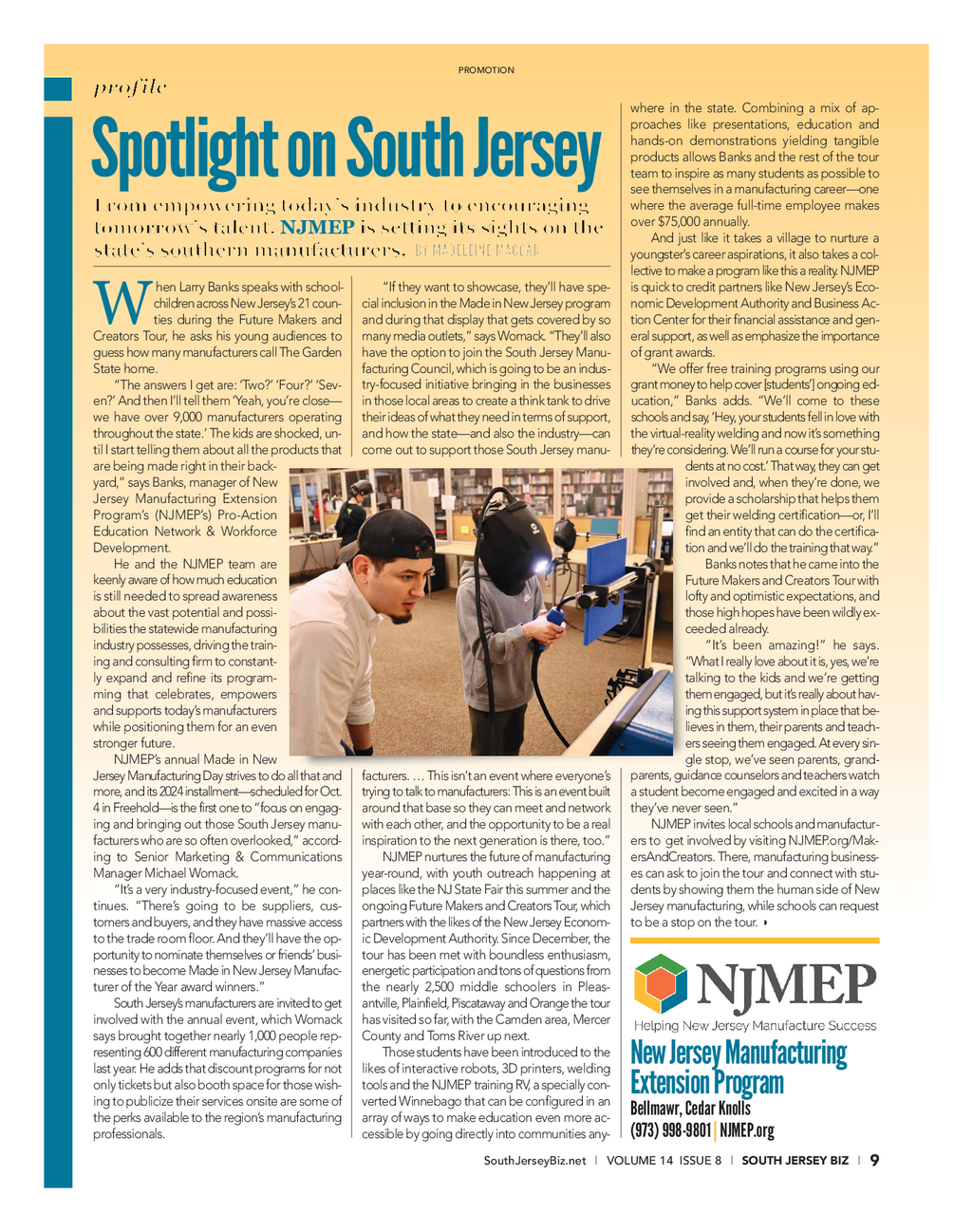 SJBiz_NJMEP_Profile_8_24_Profile 8 / 7 / 24 9 : 34 AM Page 1 PROMOTION profile where in the state . Combining a mix of ap - proaches like presentations , education and hands - on demonstrations yielding tangible products allows Banks and the rest of the tour Spotlight on South Jersey teamto inspire as many students as possible to see themselves in a manufacturing career — one where the average full - time employee makes From empowering today’s industry to encouraging over $ 75,000 annually . tomorrow’s talent , NJMEP is setting its sights on the And just like it takes a village to nurture a state’s southern manufacturers . BY MADELEINE MACCAR youngster’s career aspirations , it also takes a col - lective to make a program like this a reality . NJMEP hen Larry Banks speaks with school - “ If they want to showcase , they’ll have spe - is quick to credit partners like New Jersey’s Eco - children across New Jersey’s 21 coun - cialinclusion in the Made in New Jersey program nomicDevelopment Authority and Business Ac - Wties during the Future Makers and andduring that display that gets covered by so tionCenter for their financial assistance and gen - Creators Tour , he asks his young audiences to manymedia outlets , ” says Womack . “ They’ll also eralsupport , as well as emphasize the importance guess how many manufacturers call The Garden havethe option to join the South Jersey Manu - ofgrant awards . State home . facturing Council , which is going to be an indus - “ We offer free training programs using our “ The answers I get are : ‘ Two ? ’ ‘ Four ? ’ ‘ Sev - try - focused initiative bringing in the businesses grantmoney to help cover [ students ’ ] ongoing ed - en ? ’ And then I’ll tell them ‘ Yeah , you’re close — inthose local areas to create a think tank to drive ucation , ” Banks adds . “ We’ll come to these we have over 9,000 manufacturers operating theirideas of what they need in terms of support , schoolsand say , ‘ Hey , your students fell in love with throughout the state . ’ The kids are shocked , un - andhow the state — and also the industry — can thevirtual - reality welding and now it’s something til I start telling them about all the products that comeout to support those South Jersey manu - they’reconsidering . We’ll run a course for your stu - are being made right in their back - dentsat no cost . ’ That way , they can get yard , ” says Banks , manager of New involvedand , when they’re done , we Jersey Manufacturing Extension providea scholarship that helps them Program’s ( NJMEP’s ) Pro - Action get their welding certification — or , I’ll Education Network & Workforce findan entity that can do the certifica - Development . tion and we’ll do the training that way . ” He and the NJMEP team are Banksnotes that he came into the keenly aware of how much education FutureMakers and Creators Tour with is still needed to spread awareness loftyand optimistic expectations , and about the vast potential and possi - thosehigh hopes have been wildly ex - bilities the statewide manufacturing ceededalready . industry possesses , driving the train - “ It’s been amazing ! ” he says . ing and consulting firm to constant - “ What I really love about it is , yes , we’re ly expand and refine its program - talking to the kids and we’re getting ming that celebrates , empowers themengaged , but it’s really about hav - and supports today’s manufacturers ingthis support system in place that be - while positioning them for an even lievesin them , their parents and teach - stronger future . ers seeing them engaged . At every sin - NJMEP’s annual Made in New gle stop , we’ve seen parents , grand - Jersey Manufacturing Day strives to do all that and facturers . … This isn’t an event where everyone’s parents , guidance counselors and teachers watch more , and its 2024 installment — scheduled for Oct . tryingto talk to manufacturers : This is an event built astudent become engaged and excited in a way 4 in Freehold — is the first one to “ focus on engag - aroundthat base so they can meet and network they’venever seen . ” ing and bringing out those South Jersey manu - witheach other , and the opportunity to be a real NJMEPinvites local schools and manufactur - facturers who are so often overlooked , ” accord - inspirationto the next generation is there , too . ” ersto get involved by visiting NJMEP.org / Mak - ing to Senior Marketing & Communications NJMEPnurtures the future of manufacturing ersAndCreators.There , manufacturing business - Manager Michael Womack . year - round , with youth outreach happening at escan ask to join the tour and connect with stu - “ It’s a very industry - focused event , ” he con - placeslike the NJ State Fair this summer and the dentsby showing them the human side of New tinues . “ There’s going to be suppliers , cus - ongoingFuture Makers and Creators Tour , which Jerseymanufacturing , while schools can request w tomersand buyers , and they have massive access partnerswith the likes of the New Jersey Econom - tobe a stop on the tour . to the trade room floor . And they’ll have the op - icDevelopment Authority . Since December , the portunity to nominate themselves or friends ’ busi - tour has been met with boundless enthusiasm , nesses to become Made in New Jersey Manufac - energeticparticipation and tons of questions from turer of the Year award winners . ” the nearly 2,500 middle schoolers in Pleas - South Jersey’s manufacturers are invited to get antville , Plainfield , Piscataway and Orange the tour involved with the annual event , which Womack has visited so far , with the Camden area , Mercer says brought together nearly 1,000 people rep - County and Toms River up next . resenting 600 different manufacturing companies Those students have been introduced to the NewJersey Manufacturing lastyear . He adds that discount programs 