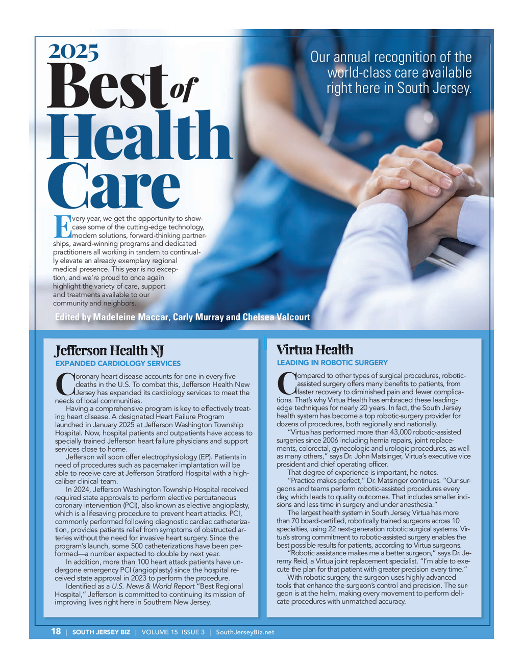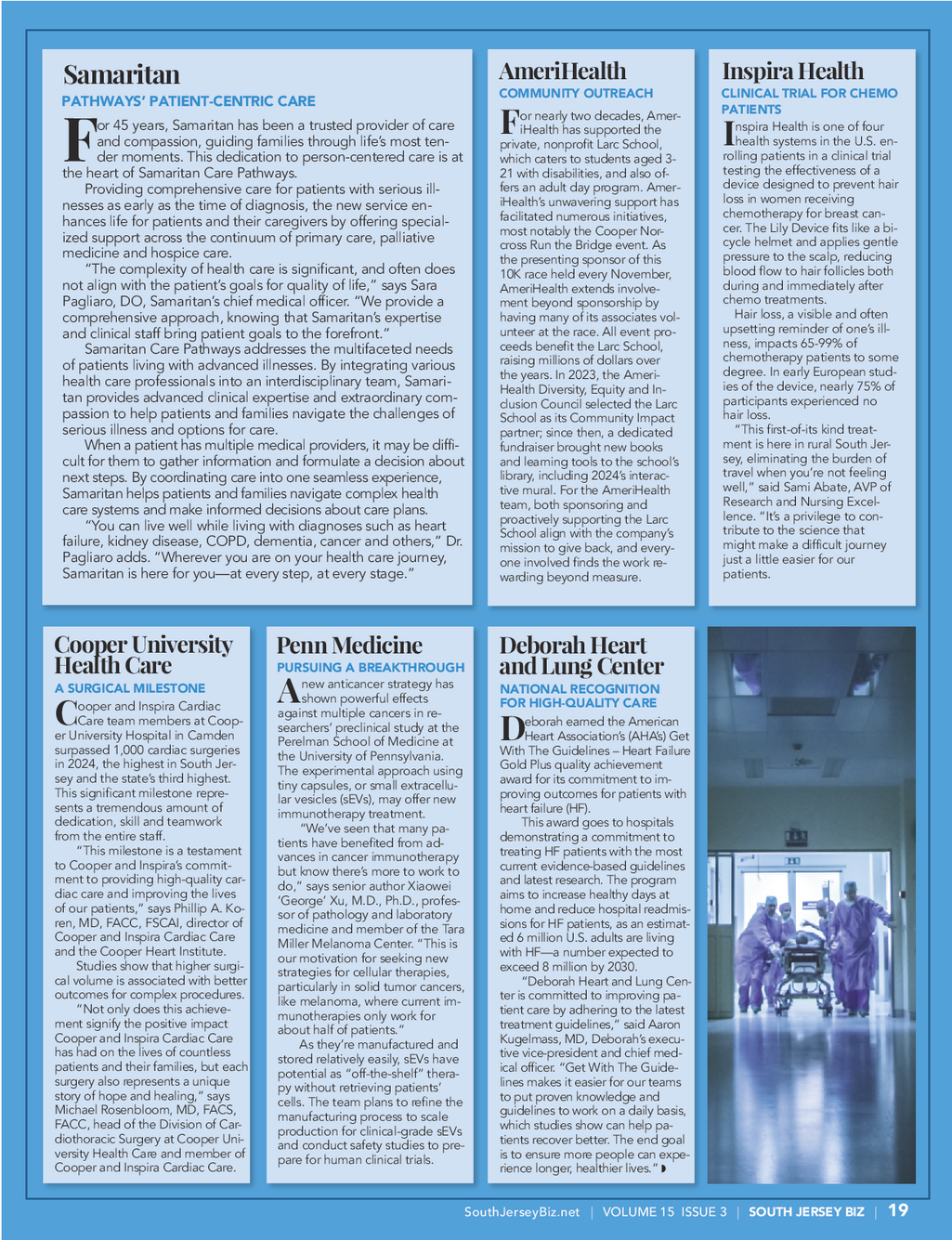 SJBiz_Best of Health Care_0325FINAL.qxp_Layout 1 3 / 6 / 25 3 : 10 PM Page 2 AmeriHealth Inspira Health Samaritan COMMUNITY OUTREACH CLINICAL TRIAL FOR CHEMO PATHWAYS ’ PATIENT - CENTRIC CARE PATIENTS ornearly two decades , Amer - or 45 years , Samaritan has been a trusted provider of care nspira is one of five East FiHealth has supported the ICoast health care systems and compassion , guiding families through life’s most ten - private , nonprofit Larc School , participating in clinical trials for Fder moments . This dedication to person - centered care is at which caters to students aged 3 - the Lily Device . The helmet - like 21 with disabilities , and also of - the heart of Samaritan Care Pathways . apparatus gently applies pres - fers an adult day program . Amer - Providing comprehensive care for patients with serious ill - sure to the scalp , reducing iHealth’s unwavering support has nesses as early as the time of diagnosis , the new service en - blood flow to hair follicles both facilitated numerous initiatives , hances life for patients and their caregivers by offering special - during and immediately follow - mostnotably the Cooper Nor - ized support across the continuum of primary care , palliative ing the infusion of chemothera - cross Run the Bridge event . As medicine and hospice care . py drugs to dramatically reduce the presenting sponsor of this “ The complexity of health care is significant , and often does hair loss in patients . 10K race held every November , Hair loss is a visible sign of not align with the patient’s goals for quality of life , ” says Sara AmeriHealthextends involve - illness that AVP of Research and Pagliaro , DO , Samaritan’s chief medical officer . “ We provide a mentbeyond sponsorship by Nursing Excellence Sami Abate having many of its associates vol - comprehensive approach , knowing that Samaritan’s expertise notes is experienced to some unteer at the race . All event pro - and clinical staff bring patient goals to the forefront . ” degree in 65 - 99 % of ceeds benefit the Larc School , Samaritan Care Pathways addresses the multifaceted needs chemotherapy patients . While raising millions of dollars over of patients living with advanced illnesses . By integrating various Inspira’s first clinical - trial patient the years . In 2023 , the Ameri - health care professionals into an interdisciplinary team , Samari - will begin treatment in coming Health Diversity , Equity and In - tan provides advanced clinical expertise and extraordinary com - weeks , nearly 75 % of partici - clusion Council selected the Larc passion to help patients and families navigate the challenges of pants in the initial European tri - Schoolas its Community Impact als experienced zero hair loss . serious illness and options for care . partner ; since then , a dedicated “ There’s no control group : When a patient has multiple medical providers , it may be diffi - fundraiserbrought new books Everyone gets a device , ” Abate and learning tools to the school’s cultfor them to gather information and formulate a decision about says , adding that they’ll also library , including 2024 ’ s interac - nextsteps . By coordinating care into one seamless experience , get more time in nurses ’ care . tive mural . For the AmeriHealth Samaritanhelps patients and families navigate complex health “ This is a cutting - edge , first - of - team , both sponsoring and caresystems and make informed decisions about care plans . its kind treatment that’s right proactively supporting the Larc “ You can live well while living with diagnoses such as heart here in our rural community , School align with the company’s failure , kidney disease , COPD , dementia , cancer and others , ” Dr . eliminating the burden of travel mission to give back , and every - Pagliaro adds . “ Wherever you are on your health care journey , when you’re not feeling well . ” one involved finds the work re - Samaritan is here for you — at every step , at every stage . ” wardingbeyond measure . Cooper University Penn Medicine Deborah Heart PURSUING A BREAKTHROUGH Health Care and Lung Center new anticancer strategy has A SURGICAL MILESTONE NATIONAL RECOGNITION Ashown powerful effects FOR HIGH - QUALITY CARE ooper and Inspira Cardiac against multiple cancers in re - CCareteam members at Coop - eborahearned the American searchers ’ preclinical study at the er University Hospital in Camden DHeartAssociation’s ( AHA’s ) Get Perelman School of Medicine at surpassed 1,000 cardiac surgeries WithThe Guidelines – Heart Failure the University of Pennsylvania . in 2024 , the highest in South Jer - GoldPlus quality achievement The experimental approach using sey and the state’s third highest . awardfor its commitment to im - tiny capsules , or small extracellu - This significant milestone repre - provingoutcomes for patients with lar vesicles ( sEVs ) , may offer new sents a tremendous amount of heart failure ( HF ) . immunotherapytreatment . dedication , skill and teamwork Thisaward goes to hospitals “ We’ve seen that many pa - from the entire staff . demonstratinga commitment to tients have benefited from ad - “ This milestone is a testament treating HF patients with the most vances in cancer immunotherapy to Cooper and Inspira’s commit - currentevidence - based guidelines but know there’s more to work to ment to providing high - quality car - andlatest research . The program do , ” says senior author Xiaowei diac care and improving the lives aims to increase healthy days at ‘ George ’ Xu , M.D . , Ph.D . , profes - of our patients , ” says Phillip A . Ko - homeand reduce hospital readmis - sor of pathology and laboratory ren , MD , FACC , FSCAI , director of sions for HF patients , as an estimat - medicine and member of the Tara Cooper and Inspira Cardiac Care ed 6 million U.S . adults are living Miller Melanoma Center . “ This is and the Cooper Heart Instit