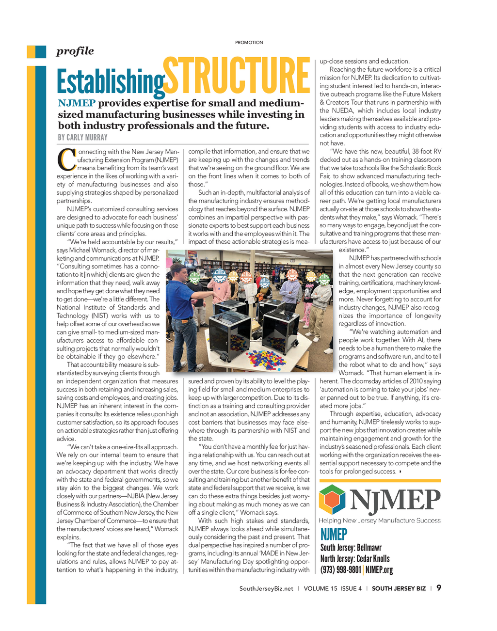 SJBiz_NJMEP_Profile_4_25_EVERGREEN_Profile 4 / 3 / 25 11 : 09 AM Page 1 PROMOTION profile up - close sessions and education . Reaching the future workforce is a critical mission for NJMEP . Its dedication to cultivat - ing student interest led to hands - on , interac - EstablishingSTRUCTURE tive outreach programs like the Future Makers & Creators Tour that runs in partnership with NJMEP provides expertise for small and medium - the NJEDA , which includes local industry sized manufacturing businesses while investing in leaders making themselves available and pro - both industry professionals and the future . viding students with access to industry edu - cation and opportunities they might otherwise BY CARLY MURRAY not have . “ We have this new , beautiful , 38 - foot RV compile that information , and ensure that we onnecting with the New Jersey Man - decked out as a hands - on training classroom are keeping up with the changes and trends ufacturing Extension Program ( NJMEP ) that we take to schools like the Scholastic Book that we're seeing on the ground floor . We are C means benefiting from its team’s vast Fair , to show advanced manufacturing tech - on the front lines when it comes to both of experience in the likes of working with a vari - nologies . Instead of books , we show them how those . ” ety of manufacturing businesses and also all of this education can turn into a viable ca - Such an in - depth , multifactorial analysis of supplying strategies shaped by personalized reer path . We're getting local manufacturers the manufacturing industry ensures method - partnerships . actually on - site at those schools to show the stu - ology that reaches beyond the surface . NJMEP NJMEP’s customized consulting services dents what they make , ” says Womack . “ There's combines an impartial perspective with pas - are designed to advocate for each business ’ so many ways to engage , beyond just the con - sionate experts to best support each business unique path to success while focusing on those sultative and training programs that these man - it works with and the employees within it . The clients ’ core areas and principles . ufacturers have access to just because of our impact of these actionable strategies is mea - “ We're held accountable by our results , ” existence . ” says Michael Womack , director of mar - NJMEP has partnered with schools keting and communications at NJMEP . in almost every New Jersey county so “ Consulting sometimes has a conno - that the next generation can receive tation to it [ in which ] clients are given the training , certifications , machinery knowl - information that they need , walk away edge , employment opportunities and and hope they get done what they need more . Never forgetting to account for to get done — we're a little different . The industry changes , NJMEP also recog - National Institute of Standards and nizes the importance of longevity Technology ( NIST ) works with us to regardless of innovation . help offset some of our overhead so we “ We're watching automation and can give small - to medium - sized man - people work together . With AI , there ufacturers access to affordable con - needs to be a human there to make the sulting projects that normally wouldn't programs and software run , and to tell be obtainable if they go elsewhere . ” the robot what to do and how , ” says That accountability measure is sub - Womack . “ That human element is in - stantiated by surveying clients through herent . The doomsday articles of 2010 saying sured and proven by its ability to level the play - an independent organization that measures ‘ automation is coming to take your jobs ’ nev - ing field for small and medium enterprises to success in both retaining and increasing sales , er panned out to be true . If anything , it's cre - keep up with larger competition . Due to its dis - saving costs and employees , and creating jobs . ated more jobs . ” tinction as a training and consulting provider NJMEP has an inherent interest in the com - Through expertise , education , advocacy and not an association , NJMEP addresses any panies it consults : Its existence relies upon high and humanity , NJMEP tirelessly works to sup - cost barriers that businesses may face else - customer satisfaction , so its approach focuses port the new jobs that innovation creates while where through its partnership with NIST and on actionable strategies rather than just offering maintaining engagement and growth for the the state . advice . industry’s seasoned professionals . Each client “ You don’t have a monthly fee for just hav - “ We can't take a one - size - fits all approach . working with the organization receives the es - ing a relationship with us . You can reach out at We rely on our internal team to ensure that sential support necessary to compete and the any time , and we host networking events all we're keeping up with the industry . We have w tools for prolonged success . over the state . Our core business is for - fee con - an advocacy department that works directly sulting and training but another benefit of that with the state and federal governments , so we state and federal support that we receive , is we stay akin to the biggest changes . We work can do these extra things besides just worry - closely with our partners — NJBIA ( New Jersey ing about making as much money as we can Business & Industry Association ) , the Chamber off a single client , ” Womack says . of Commerce of Southern New Jersey , the New With such high stakes and standards , Jersey Chamber of Commerce — to ensure that NJMEP always looks ahead while simultane - the manufacturers ' voices are heard , ” Womack ously considering the past and present . That explains . NJMEP dual perspective has inspired a number of pro - “ The fact that we have all of those eyes South Jersey : Bellmawr grams , including its annual ‘ MADE in New Jer - looking 