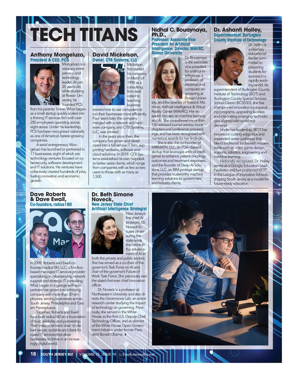 SJBiz _Tech Titans_1025FINAL.qxp_Layout 1 10 / 9 / 25 11 : 50 AM Page 3 Nidhal C . Bouaynaya , Dr . Ashanti Holley , Ph.D . , Superintendent , Burlington Professor ; Associate Vice TECH TITANS County Institute of Technology President for Artificial Dr . Holley is Intelligence ; Director , MAVRC , a visionary Rowan University educational AnthonyMongeluzo , David Mickelson , Dr . Bouaynaya leader com - President & CEO , PCS Owner , CTB Systems , LLC is the associate mitted to Mongeluzo is a Mickelson vice president preparing visionary entre - first started for artificial in - students for preneur and his company telligence , a success in a technology in March of professor of rapidly evolv - leader . At just 1994 as a electrical and ing world . As 20 years old , consulting computer en - superintendent of Burlington County while studying firm dedi - gineering at Institute of Technology ( BCIT ) and at Rowan Uni - cated to Rowan Univer - Burlington County Special Services versity , he teaching sity , and the director of Rowan’s Ma - School District ( BCSSSD ) , she has founded PCS business chine , Artificial Intelligence & Virtual championed innovation by expand - from his parents ’ home . What began owners how to use computers to Reality Center ( MAVRC ) . Her re - ing programs , upgrading facilities as a small startup quickly scaled into run their businesses more efficiently . search focuses on machine learning and integrating emerging technolo - a thriving IT services firm with over Four years later , the company and AI . She co - authored more than gies aligned with workforce 250 employees operating across merged with a network and hard - 120 refereed journal articles , book demand . eight states . Under his leadership , ware company , and CTB Systems , chapters and conference proceed - Under her leadership , BCIT has PCS has been recognized nationally LLC , was created . ings , and has been recognized with invested in cutting - edge labs and as one of America’s fastest - growing In the years since then , the numerous awards for her findings . expanded career pathways that companies . company has grown and devel - She is also the co - founder of blend traditional trades with modern A serial entrepreneur , Mon - oped into a full - service IT firm , sup - MRIMATH , LLC , an FDA - cleared fields such as video game design , geluzo has launched or partnered in porting hardware , software and startup that leverages artificial intelli - e - sports , robotics , engineering and 11 businesses , eight of which are cloud solutions . In 2019 , CTB Sys - gence to enhance patient oncology machine learning . technology ventures focused on cy - tems established its own helpdesk outcomes and treatment responses , Nationally recognized , Dr . Holley bersecurity , software development to better assist clients , which range and the founder of Deep AI Solu - serves as a Google Education Lead and IT solutions . His ventures have from companies with as few as two tions , LLC , an IBM - protégé startup Facilitator and has positioned BCIT collectively created hundreds of jobs , users to those with as many as that provides trustworthy machine in the League of Innovative Schools , fueling innovation and economic 1,500 . learning solutions to government shaping South Jersey as a model for growth . and industry clients . future - ready education . Dave Roberts Dr . Beth Simone & Dave Ewall , Noveck , New Jersey State Chief Co - founders , radius180 Artificial Intelligence Strategist New Jersey’s first chief AI strategist , Dr . Noveck fo - cuses on en - suring the state leads the nation in the advance - ment of AI in both the private and public sectors . She has served as a co - chair of the In 2009 , Roberts and Ewall co - governor’s Task Force on AI and founded radius180 , LLC , a Marlton - chair of the governor’s Future of based managed IT services provider Work Task Force . She previously was specializing in cybersecurity , network the state’s first - ever chief innovation support and strategic IT consulting . officer . What began in a garage with two Dr . Noveck is a professor at partners has grown into a thriving Northeastern University and also di - company with more than 30 em - rects the Governance Lab , an action ployees , serving businesses across research center studying the impact South Jersey , Philadelphia and East - of technology on governing . Previ - ern Pennsylvania . ously , she served in the White Together , Roberts and Ewall House as the first U.S . Deputy Chief have built radius180 on a foundation Technology Officer , and as director of trust , reliability and partnership . of the White House Open Govern - Their mission remains clear : to de - ment Initiative under former Presi - liver secure , scalable and client - fo - dent Barack Obama . w cused IT services that allow businesses to thrive in an increas - ingly digital world . 18 | SOUTH JERSEY BIZ | VOLUME 15 ISSUE 10 | SouthJerseyBiz.net