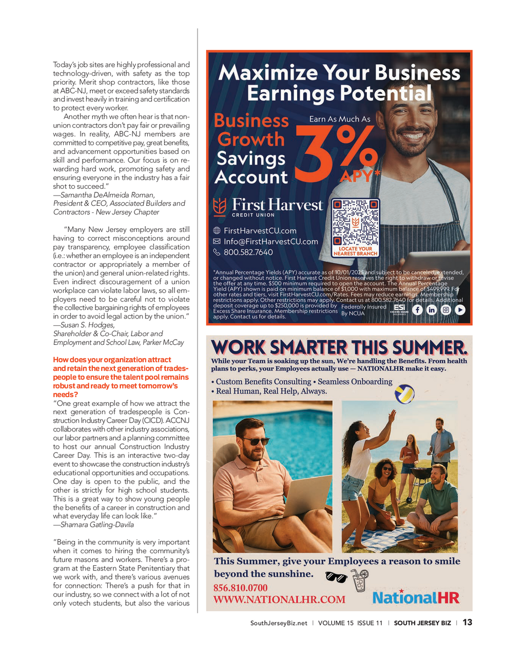 1125 Labor Dept - FINAL_Layout 1 11 / 6 / 25 2 : 13 PM Page 3 employment and labor law benefit growing frustration many middle - class L A B O R your union clients ? families feel about the widening gap be - “ Parker McCay represents employers of tweenthe very wealthy and working peo - all sizes , and our knowledge of both em - ple.Even though wages have gone up in schools and resources in and around the ployment and labor laws gives our pub - many industries , there are still families city of Philadelphia . ” lic - sector clients an edge because we living paycheck to paycheck . … We are — Amy Hennessey assist them with legal compliance , as well seeingmore workers realize that they de - as helping them minimize labor disputes serve fair treatment and a voice on the What can be done to ensure that and strengthening workplace relationships job . Younger generations , in particular , students and future members of the between the employers and the unions . aregravitating toward the trades because workforce know there are rewarding , With effective training for managers and they want stability , purpose and a clear family - supporting careers available to non - unionizedstaff on how to handle em - path to success . Many see [ us ] as that them in the trades ? ploymentissues with union members , we path because it’s a way to earn a good “ We need to show students — especially helpour clients avoid matters that lead to living , learn valuable skills , and be part of women and minorities — that the trades grievances and arbitrations , which limit a brotherhood and sisterhood . are for everyone . At ABC - NJ , we work employerliability and also improves morale To keep this momentum going , we hard to break down stereotypes and open in the workplace . ” have to continue organizing , telling our doors by partnering with schools , com - — Susan Hodges story , and showing that unions are still the munity groups , and workforce programs best way for working people to build sta - that reach underrepresented populations . With national trends increasingly bility and opportunity . The EAS Carpenters When people see others like them thriving indicating a rise in union support , do Unionis focused on outreach and educa - in the trades , it changes perceptions . you anticipate that pattern’s staying tion , making sure the next generation These are good , family - supporting careers power ? What can be done to ensure knows this is a pathway to a real career . where anyone with drive and skill can suc - the trend toward unionizing We’re also continuing to invest in training , ceed . The more diverse our workforce , continues ? expandaccessto apprenticeship programs , the stronger our industry becomes . ” “ Absolutely . The rise in union support re - andensure every worker understands the — Samantha DeAlmeida Roman flects what we’ve always known — and value of standing together for fair wages , that’s when workers stand together , they benefits and respect on the job . ” w How does bringing expertise in both have power . But it also speaks to the — William C Sproule 14 | SOUTH JERSEY BIZ | VOLUME 15 ISSUE 11 | SouthJerseyBiz.net