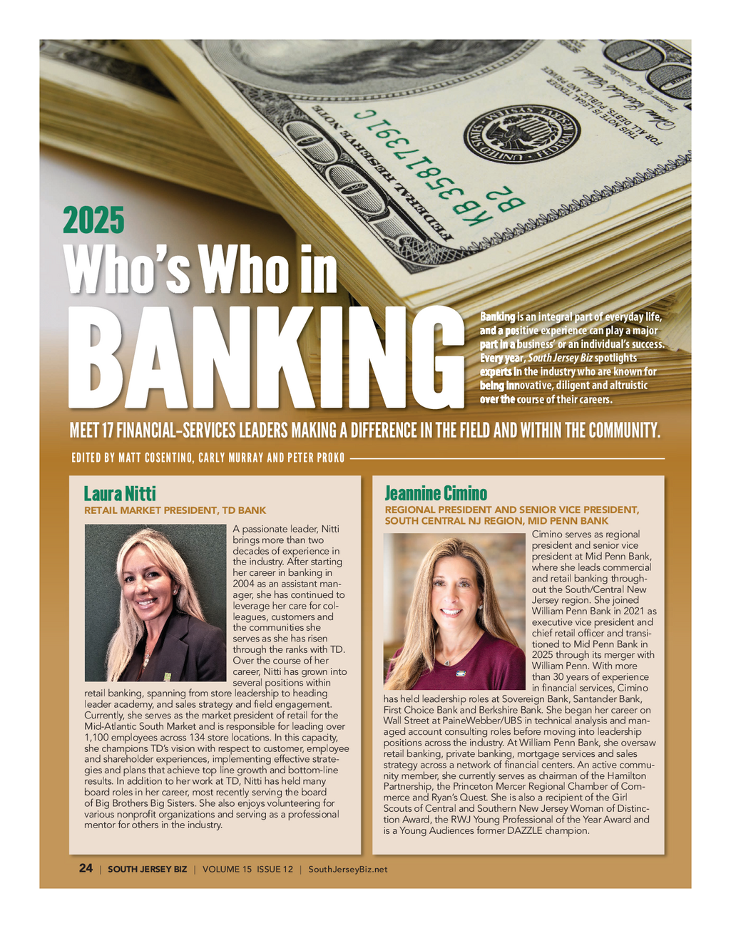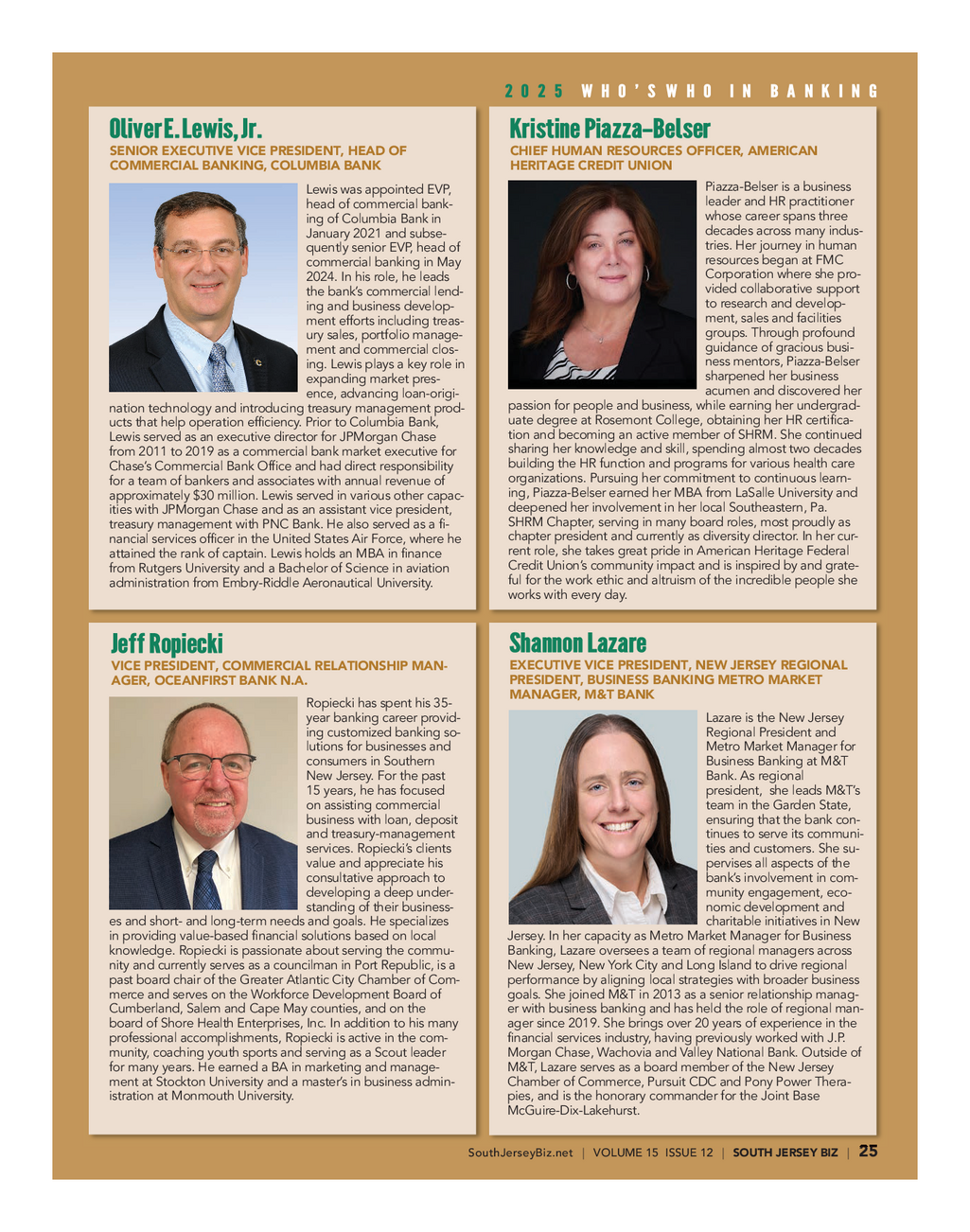 SJBiz_WhosWho in Banking_1225FINAL.qxp_Layout 1 12 / 5 / 25 10 : 46 AM Page 2 2 0 2 5 W H O ’ S W H O I N B A N K I N G Oliver E.Lewis , Jr . Kristine Piazza - Belser SENIOR EXECUTIVE VICE PRESIDENT , HEAD OF CHIEF HUMAN RESOURCES OFFICER , AMERICAN COMMERCIAL BANKING , COLUMBIA BANK HERITAGE CREDIT UNION Piazza - Belser is a business Lewis was appointed EVP , leader and HR practitioner head of commercial bank - whose career spans three ing of Columbia Bank in decades across many indus - January 2021 and subse - tries . Her journey in human quently senior EVP , head of resources began at FMC commercial banking in May Corporation where she pro - 2024 . In his role , he leads vided collaborative support the bank’s commercial lend - to research and develop - ing and business develop - ment , sales and facilities ment efforts including treas - groups . Through profound ury sales , portfolio manage - guidance of gracious busi - ment and commercial clos - ness mentors , Piazza - Belser ing . Lewis plays a key role in sharpened her business expanding market pres - acumen and discovered her ence , advancing loan - origi - passion for people and business , while earning her undergrad - nation technology and introducing treasury management prod - uate degree at Rosemont College , obtaining her HR certifica - ucts that help operation efficiency . Prior to Columbia Bank , tion and becoming an active member of SHRM . She continued Lewis served as an executive director for JPMorgan Chase sharing her knowledge and skill , spending almost two decades from 2011 to 2019 as a commercial bank market executive for building the HR function and programs for various health care Chase’s Commercial Bank Office and had direct responsibility organizations . Pursuing her commitment to continuous learn - for a team of bankers and associates with annual revenue of ing , Piazza - Belser earned her MBA from LaSalle University and approximately $ 30 million . Lewis served in various other capac - deepened her involvement in her local Southeastern , Pa . ities with JPMorgan Chase and as an assistant vice president , SHRM Chapter , serving in many board roles , most proudly as treasury management with PNC Bank . He also served as a fi - chapter president and currently as diversity director . In her cur - nancial services officer in the United States Air Force , where he rent role , she takes great pride in American Heritage Federal attained the rank of captain . Lewis holds an MBA in finance Credit Union’s community impact and is inspired by and grate - from Rutgers University and a Bachelor of Science in aviation ful for the work ethic and altruism of the incredible people she administration from Embry - Riddle Aeronautical University . works with every day . Shannon Lazare Jeff Ropiecki EXECUTIVE VICE PRESIDENT , NEW JERSEY REGIONAL VICE PRESIDENT , COMMERCIAL RELATIONSHIP MAN - PRESIDENT , BUSINESS BANKING METRO MARKET AGER , OCEANFIRST BANK N.A . MANAGER , M & T BANK Ropiecki has spent his 35 - year banking career provid - Lazare is the New Jersey ing customized banking so - Regional President and lutions for businesses and Metro Market Manager for consumers in Southern Business Banking at M & T New Jersey . For the past Bank . As regional 15 years , he has focused president , she leads M & T’s on assisting commercial team in the Garden State , business with loan , deposit ensuring that the bank con - and treasury - management tinues to serve its communi - services . Ropiecki’s clients ties and customers . She su - value and appreciate his pervises all aspects of the consultative approach to bank’s involvement in com - developing a deep under - munity engagement , eco - standing of their business - nomic development and es and short - and long - term needs and goals . He specializes charitable initiatives in New in providing value - based financial solutions based on local Jersey . In her capacity as Metro Market Manager for Business knowledge . Ropiecki is passionate about serving the commu - Banking , Lazare oversees a team of regional managers across nity and currently serves as a councilman in Port Republic , is a New Jersey , New York City and Long Island to drive regional past board chair of the Greater Atlantic City Chamber of Com - performance by aligning local strategies with broader business merce and serves on the Workforce Development Board of goals . She joined M & T in 2013 as a senior relationship manag - Cumberland , Salem and Cape May counties , and on the er with business banking and has held the role of regional man - board of Shore Health Enterprises , Inc . In addition to his many ager since 2019 . She brings over 20 years of experience in the professional accomplishments , Ropiecki is active in the com - financial services industry , having previously worked with J.P . munity , coaching youth sports and serving as a Scout leader Morgan Chase , Wachovia and Valley National Bank . Outside of for many years . He earned a BA in marketing and manage - M & T , Lazare serves as a board member of the New Jersey ment at Stockton University and a master’s in business admin - Chamber of Commerce , Pursuit CDC and Pony Power Thera - istration at Monmouth University . pies , and is the honorary commander for the Joint Base McGuire - Dix - Lakehurst . SouthJerseyBiz.net | VOLUME 15 ISSUE 12 | SOUTH JERSEY BIZ | 25