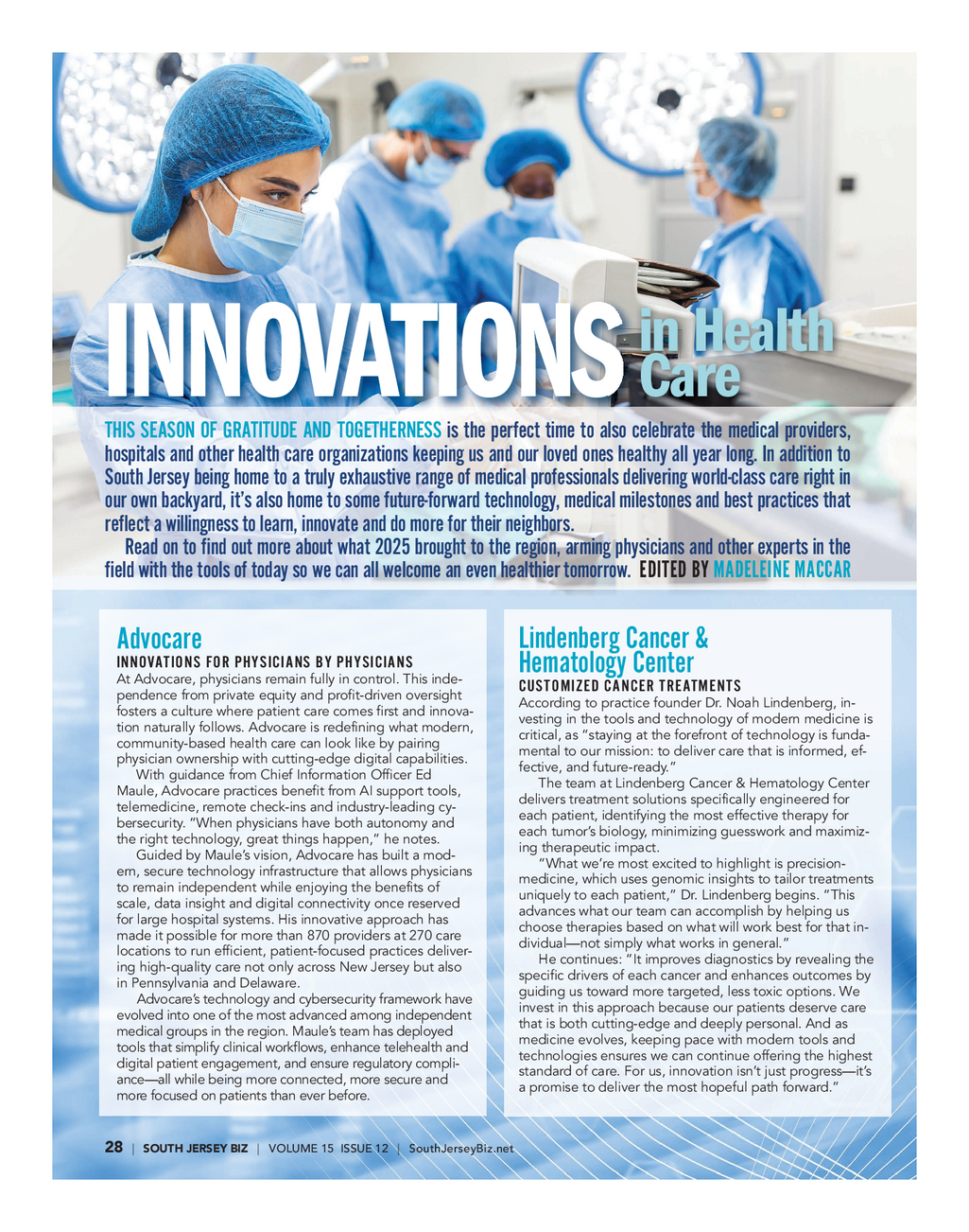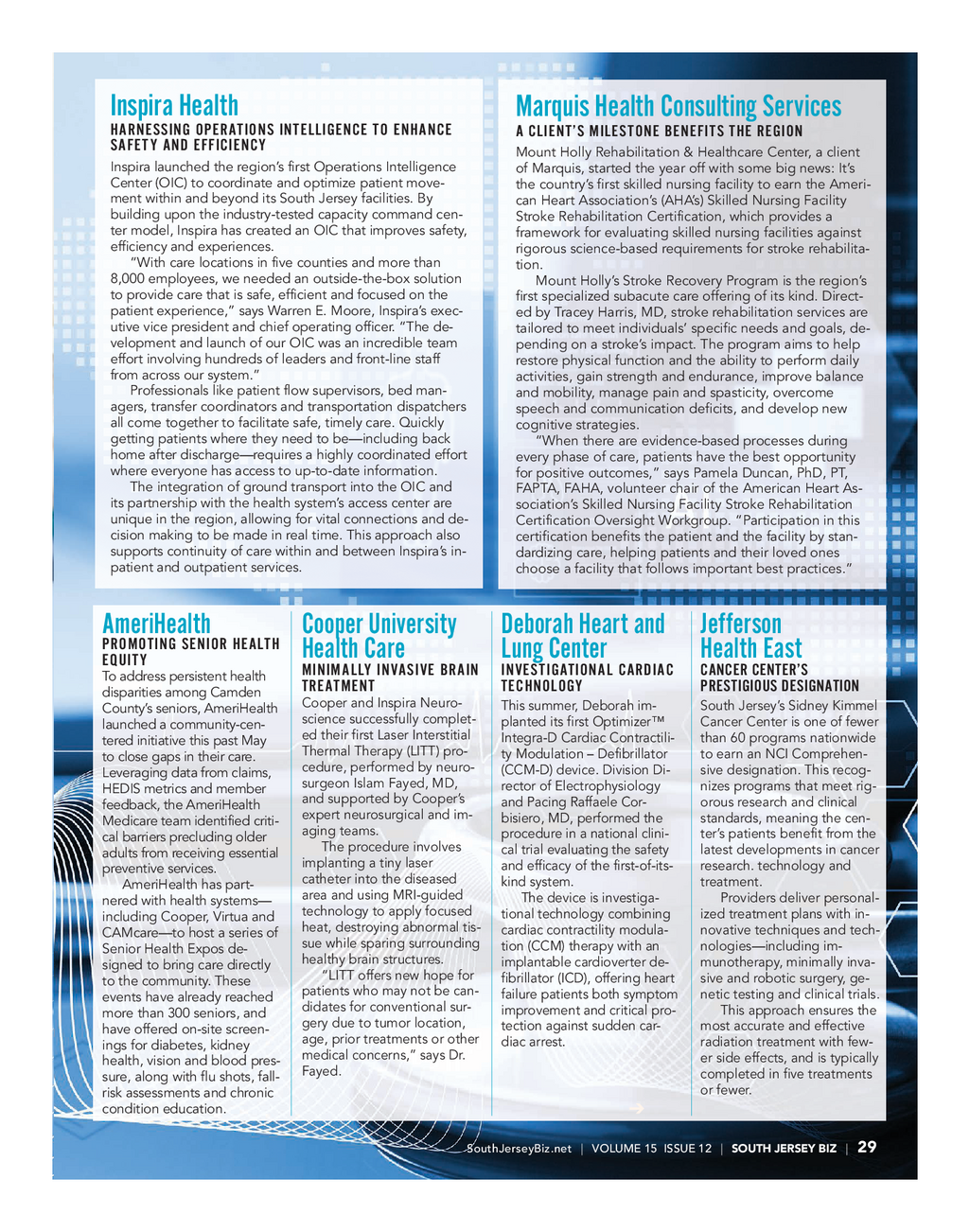 Biz_Innovations in Health Care_1225 - V2_Layout 1 12 / 5 / 25 4 : 11 PM Page 2 Inspira Health Marquis Health Consulting Services HARNESSING OPERATIONS INTELLIGENCE TO ENHANCE A CLIENT’S MILESTONE BENEFITS THE REGION SAFET Y AND EFFICIENCY Mount Holly Rehabilitation & Healthcare Center , a client Inspira launched the region’s first Operations Intelligence of Marquis , started the year off with some big news : It’s Center ( OIC ) to coordinate and optimize patient move - the country’s first skilled nursing facility to earn the Ameri - ment within and beyond its South Jersey facilities . By can Heart Association’s ( AHA’s ) Skilled Nursing Facility building upon the industry - tested capacity command cen - Stroke Rehabilitation Certification , which provides a ter model , Inspira has created an OIC that improves safety , framework for evaluating skilled nursing facilities against efficiency and experiences . rigorous science - based requirements for stroke rehabilita - “ With care locations in five counties and more than tion . 8,000 employees , we needed an outside - the - box solution Mount Holly’s Stroke Recovery Program is the region’s to provide care that is safe , efficient and focused on the first specialized subacute care offering of its kind . Direct - patient experience , ” says Warren E . Moore , Inspira’s exec - ed by Tracey Harris , MD , stroke rehabilitation services are utive vice president and chief operating officer . “ The de - tailored to meet individuals ’ specific needs and goals , de - velopment and launch of our OIC was an incredible team pending on a stroke’s impact . The program aims to help effort involving hundreds of leaders and front - line staff restore physical function and the ability to perform daily from across our system . ” activities , gain strength and endurance , improve balance Professionals like patient flow supervisors , bed man - and mobility , manage pain and spasticity , overcome agers , transfer coordinators and transportation dispatchers speech and communication deficits , and develop new all come together to facilitate safe , timely care . Quickly cognitive strategies . getting patients where they need to be — including back “ When there are evidence - based processes during home after discharge — requires a highly coordinated effort every phase of care , patients have the best opportunity where everyone has access to up - to - date information . for positive outcomes , ” says Pamela Duncan , PhD , PT , The integration of ground transport into the OIC and FAPTA , FAHA , volunteer chair of the American Heart As - its partnership with the health system’s access center are sociation’s Skilled Nursing Facility Stroke Rehabilitation unique in the region , allowing for vital connections and de - Certification Oversight Workgroup . “ Participation in this cision making to be made in real time . This approach also certification benefits the patient and the facility by stan - supports continuity of care within and between Inspira’s in - dardizing care , helping patients and their loved ones patient and outpatient services . choose a facility that follows important best practices . ” AmeriHealth Cooper University Deborah Heart and Jefferson PROMOTING SENIOR HEALTH Health Care Lung Center Health East EQUIT Y MINIMALLY INVASIVE BRAIN INVESTIGATIONAL CARDIAC CANCER CENTER’S To address persistent health TREATMENT TECHNOLOGY PRESTIGIOUS DESIGNATION disparities among Camden Cooper and Inspira Neuro - This summer , Deborah im - South Jersey’s Sidney Kimmel County’s seniors , AmeriHealth science successfully complet - planted its first Optimizer ™ Cancer Center is one of fewer launched a community - cen - ed their first Laser Interstitial Integra - D Cardiac Contractili - than 60 programs nationwide tered initiative this past May Thermal Therapy ( LITT ) pro - ty Modulation – Defibrillator to earn an NCI Comprehen - to close gaps in their care . cedure , performed by neuro - ( CCM - D ) device . Division Di - sive designation . This recog - Leveraging data from claims , surgeon Islam Fayed , MD , rector of Electrophysiology nizes programs that meet rig - HEDIS metrics and member and supported by Cooper’s and Pacing Raffaele Cor - orous research and clinical feedback , the AmeriHealth expert neurosurgical and im - bisiero , MD , performed the standards , meaning the cen - Medicare team identified criti - aging teams . procedure in a national clini - ter’s patients benefit from the cal barriers precluding older The procedure involves cal trial evaluating the safety latest developments in cancer adults from receiving essential implanting a tiny laser and efficacy of the first - of - its - research . technology and preventive services . catheter into the diseased kind system . treatment . AmeriHealth has part - area and using MRI - guided The device is investiga - Providers deliver personal - nered with health systems — technology to apply focused tional technology combining ized treatment plans with in - including Cooper , Virtua and heat , destroying abnormal tis - cardiac contractility modula - novative techniques and tech - CAMcare — to host a series of sue while sparing surrounding tion ( CCM ) therapy with an nologies — including im - Senior Health Expos de - healthy brain structures . implantable cardioverter de - munotherapy , minimally inva - signed to bring care directly “ LITT offers new hope for fibrillator ( ICD ) , offering heart sive and robotic surgery , ge - to the community . These patients who may not be can - failure patients both symptom netic testing and clinical trials . events have already reached didates for conventional sur - improvement and critical pro - This approach ensures the more than 300 seniors , and gery due to tumor location , tection against sudden car - most accurate and effective have offered on - site screen - age , prior treatments or other diac arrest . 