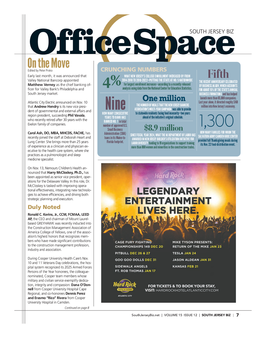SJBiz_Office Space_1225_Profile 12 / 5 / 25 3 : 48 PM Page 2 SOUTH JERSEY BIZ OfficeSpace OntheMove Edited by Peter Proko CRUNCHING NUMBERS Early last month , it was announced that WHATNEW JERSEY’S COLLEGE ENROLLMENT INCREASED BY FROM Fifth 2014 - 2018 TO 2018 - 2022 — PUTTING THE STATE AT NO . 5 NATIONWIDE Valley National Bancorp appointed THERECENT ANNIVERSARY CELEBRATED 4 % forlargestenrollment increases — according to a recently released Matthew Verney as the chief banking of - BYBUSINESS.NJ.GOV , WHICH ACCOUNTS analysisusing data from the National Center for Education Statistics . ficer for Valley Bank’s Philadelphia and FORABOUT 15 % OF THE STATE’S ANNUAL South Jersey market . BUSINESS FORMATIONS and has helped launch more than 65,000 companies . One million Last year alone , it directed roughly $ 168 Atlantic City Electric announced on Nov . 10 THENUMBER OF MEALS THAT THE NEW JERSEY BANKERS million into New Jersey’s economy . that Andrew Hendry is its new vice presi - Nine ASSOCIATION’SMULTI - YEARCAMPAIGN was able to provide dent of governmental and external affairs and tostatewide residents facing food insecurity — two years HOWMANY CONSECUTIVE region president , succeeding Phil Vavala , ahead of the initiative’s original schedule . YEARS TD BANK HAS who recently retired after 30 years with the RANKED NO . 1 in total Exelon family of companies . 1,300 numberof approved U.S . $ 8.9 million Small Business HOWMANY FAMILIES FOR WHOM THE Carol Ash , DO , MBA , MHCDS , FACHE , has Administration ( SBA ) SINCEFISCAL YEAR 2024 , WHAT THE NJ DEPARTMENT OF LABOR HAS SALVATIONARMY CAMDEN KROC CENTER recently joined the staff at Deborah Heart and loansin its Maine - to - AWARDEDIN NEW JERSEY BUILDER’S UTILIZATION INITIATIVE FOR provided full Thanksgiving meals during Floridafootprint . Lung Center . She brings more than 25 years LABORDIVERSITY funding to 19 organizations to support training its Nov . 22 food - distribution event . of experience as a clinician and physician ex - morethan 800 women and minorities in the construction trades . ecutive to the health care system , where she practices as a pulmonologist and sleep medicine specialist . On Nov . 13 , Nemours Children’s Health an - nounced that Harry McCloskey , Ph.D . , has been appointed as senior vice president , oper - ations for the Delaware Valley . In this role , Dr . McCloskey is tasked with improving opera - tional effectiveness , integrating new technolo - gies to achieve efficiencies , and driving both strategic planning and execution . Duly Noted Ronald C . Kerins , Jr . , CCM , FCMAA , LEED AP , the CEO and chairman of Mount Laurel - based GREYHAWK was recently inducted into the Construction Management Association of America College of Fellows , one of the associ - ation’s highest honors that recognizes mem - bers who have made significant contributions to the construction management profession , industry and association . During Cooper University Health Care’s Nov . 10 and 11 Veterans Day celebrations , the hos - pital system recognized its 2025 Armed Forces Persons of the Year honorees , the colleague - nominated , Cooper team members whose military and civilian service exemplify dedica - tion , integrity and compassion : Dana O’Don - nell from Cooper University Hospital Cape Regional , and co - honorees Dennis Perez and Erasmo “ Rico ” Rivera from Cooper University Hospital in Camden . Continued on page 8 SouthJerseyBiz.net | VOLUME 15 ISSUE 12 | SOUTH JERSEY BIZ | 7