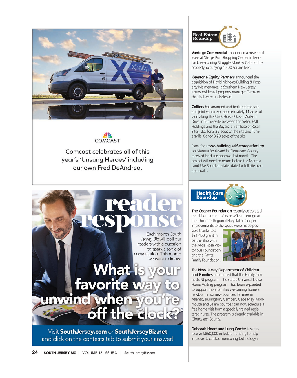SJBiz_HC - RE_Roundups_0326_AroundTown 3 / 10 / 26 11 : 43 AM Page 1 Vantage Commercial announced a new retail lease at Sharps Run Shopping Center in Med - ford , welcoming Struggle Monkey Cafe to the property , occupying 1,400 square feet . Keystone Equity Partners announced the acquisition of David Nicholas Building & Prop - erty Maintenance , a Southern New Jersey luxury residential property manager . Terms of the deal were undisclosed . Colliers has arranged and brokered the sale and joint venture of approximately 11 acres of land along the Black Horse Pike at Watson Drive in Turnersville between the Seller , EML Holdings and the Buyers , an affiliate of Retail Sites , LLC for 3.25 acres of the site and Turn - ersville Kia for 8.29 acres of the site . Plans for a two - building self - storage facility on Mantua Boulevard in Gloucester County received land use approval last month . The project will need to return before the Mantua Land Use Board at a later date for full site plan approval . ! Health Care Roundup The Cooper Foundation recently celebrated the ribbon - cutting of its new Teen Lounge at the Children’s Regional Hospital at Cooper . Improvements to the space were made pos - sible thanks to a $ 21,450 grant in partnership with the Alicia Rose Vic - torious Foundation and the Ravitz Family Foundation . The New Jersey Department of Children and Families announced that the Family Con - nects NJ program — the state’s Universal Nurse Home Visiting program — has been expanded to support more families welcoming home a newborn in six new counties . Families in Atlantic , Burlington , Camden , Cape May , Mon - mouth and Salem counties can now schedule a free home visit from a specially trained regis - tered nurse . The program is already available in Gloucester County . Deborah Heart and Lung Center is set to receive $ 850,000 in federal funding to help improve its cardiac monitoring technology . ! 24 | SOUTH JERSEY BIZ | VOLUME 16 ISSUE 3 | SouthJerseyBiz.net
